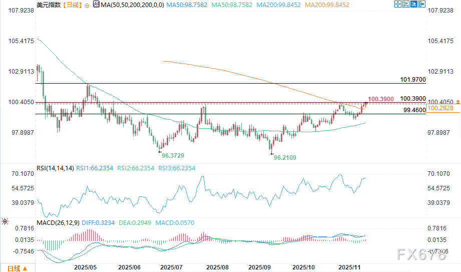 汇通财经APP讯——美元指数在早盘承压后反弹,目前正朝着当日高点100.39推进。尽管市场对12月“降息”的讨论愈发激烈,买盘仍持续支撑汇价走强。此次反弹反映出,在交易员重新评估政策预期并于波动周后调整仓位的背景下,美元需求依然稳固。