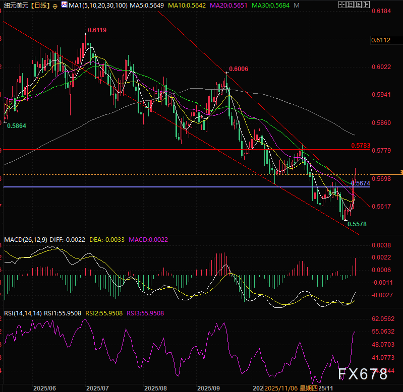 汇通财经APP讯——周四(11月27日)纽元对美元继续保持反弹格局,汇价连续两天反弹超过1.5%,目前交投于0.57