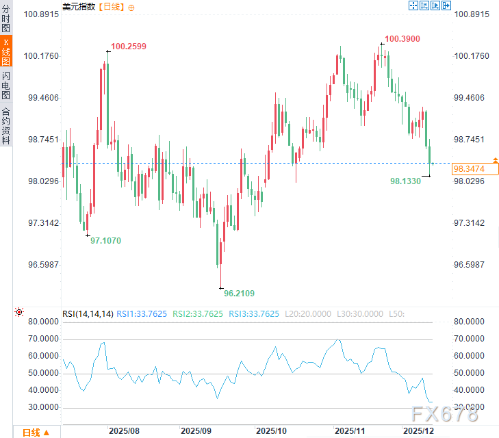 当前,美元的驱动逻辑已从“通胀恐惧”切换为“衰退担忧”。美联储为拯救就业市场而提前并可能加深降息周期,是美元趋势转弱的核心信号。然而,由于内部鹰派阻力、通胀绝对水平仍高,美元的下跌之路不会一帆风顺,或将充满反复和波折。周五亚市早盘时段,美元指数于98.35附近震荡,前两个交易日连续下跌,周四一度触及98.13的近七周低点。