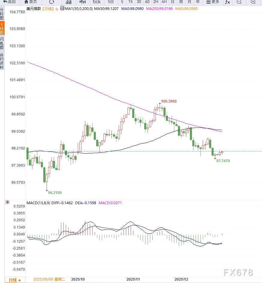 当前美元指数处于“政策预期走弱”与“避险需求托底”的拉锯阶段。假期因素限制了波动幅度,但并未改变中期偏弱的基本格局。在缺乏强劲数据或明确政策信号之前,DXY更可能维持在98附近反复震荡,等待美联储政策路径与全球风险情绪给出新的方向指引。