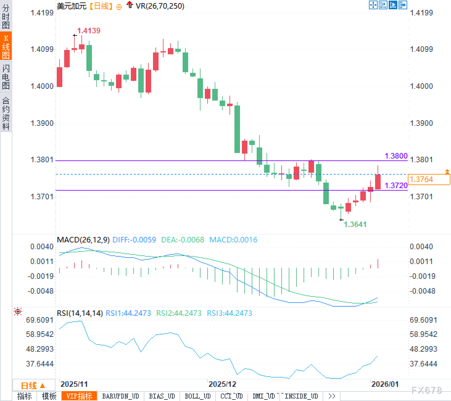 美元兑加元的这轮反弹具有典型的“低位修复”特征。日线图上,汇价此前在1.3641附近形成阶段低点后连续走高,当前处于近两周相对高位区域。技术结构上,1.3720附近可被视作近期反弹的关键分水岭:该区域既是前期震荡带的下沿,也是回撤时多空容易重新博弈的位置。上方1.3800一线则更像是短期压力区,若价格在此反复受阻,说明反弹动能仍以修复为主,市场需要新的基本面催化来打破均衡。指标层面,MACD柱状图已由负转正但仍处低位,显示下跌动能在衰减、上行动能在积累;RSI回升至约44附近,意味着超卖修复正在进行,但距离强势区仍有空间。这一组合更符合“趋势下行后的反弹整理”,而非已经进入单边强势的状态。